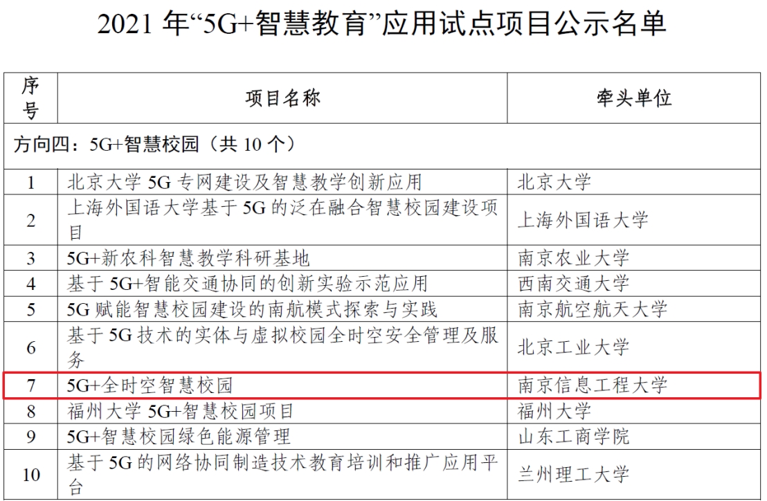 为培育一批以5G为代表的新一代信息通信技术与教育教学融合创新的应用标杆项目,引导5G赋能教育高质量发展,2021年9月,工业和信息化部办公厅、教育部办公厅组织开展“5G+智慧教育”应用试点项目申报工作。我校根据相关通知要求,精心组织,认真筹备。在校领导的关心指导下,由信息化建设与管理处、教务处、实验室与设备管理处、计算机学院、人工智能学院等部门组织撰写材料申报的“5G+全时空智慧校园”已于近日获批,全国仅10所高校获批“5G+智慧校园”。