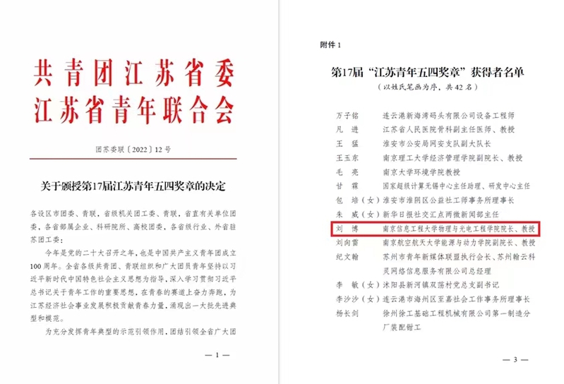 5月4日,第17届“江苏青年五四奖章”评选结果揭晓,我校物理与光电工程学院刘博教授喜获表彰。